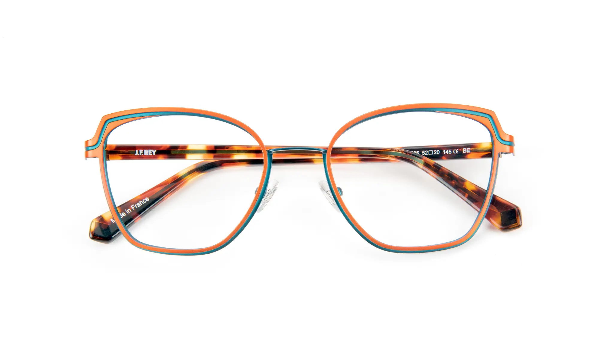 A frame with metal front and acetate temples, featuring finely worked metal with a refined, graphic design. The front features an elegant two-tone color scheme, harmoniously complemented by temples in coordinating shades, for a modern, sophisticated look.