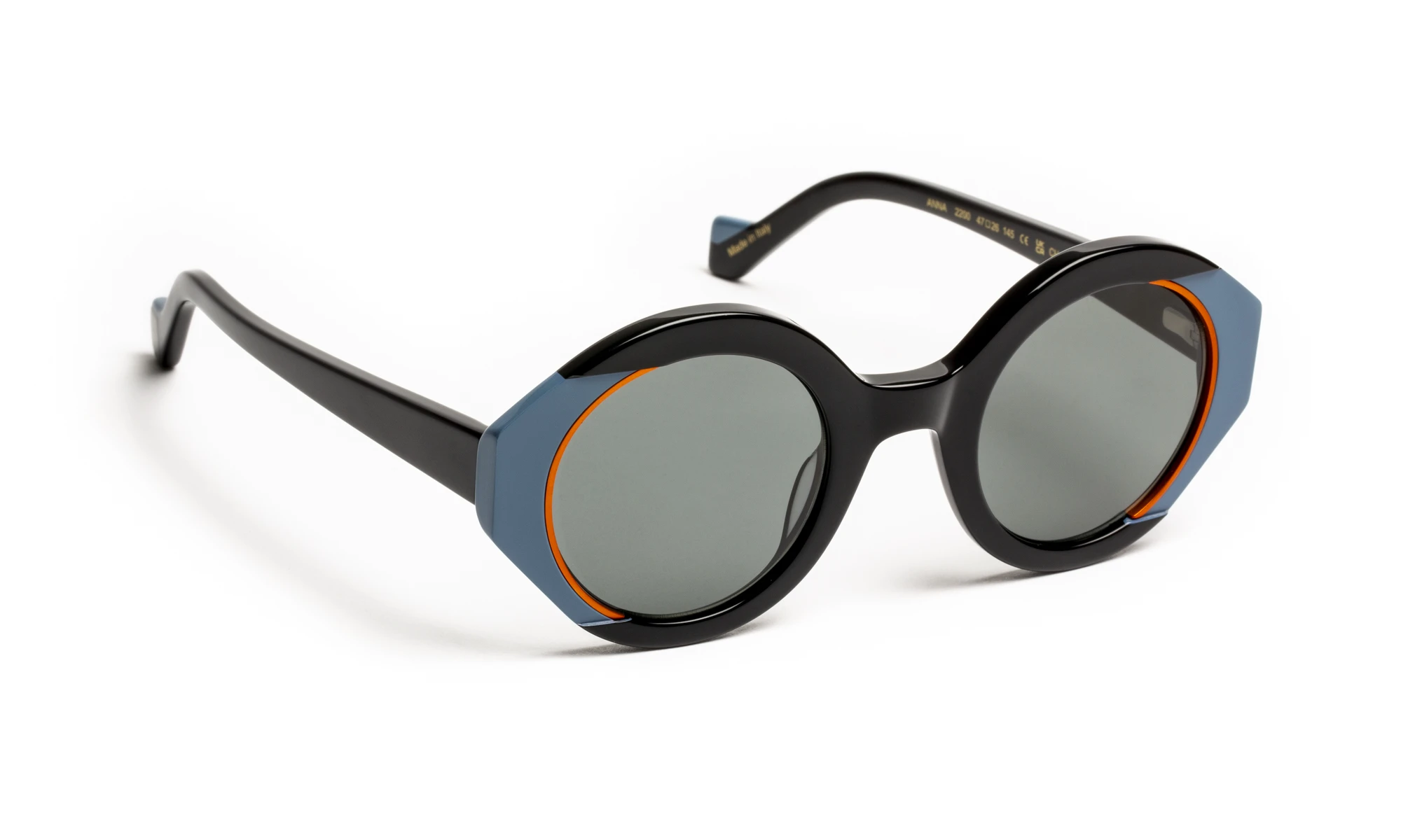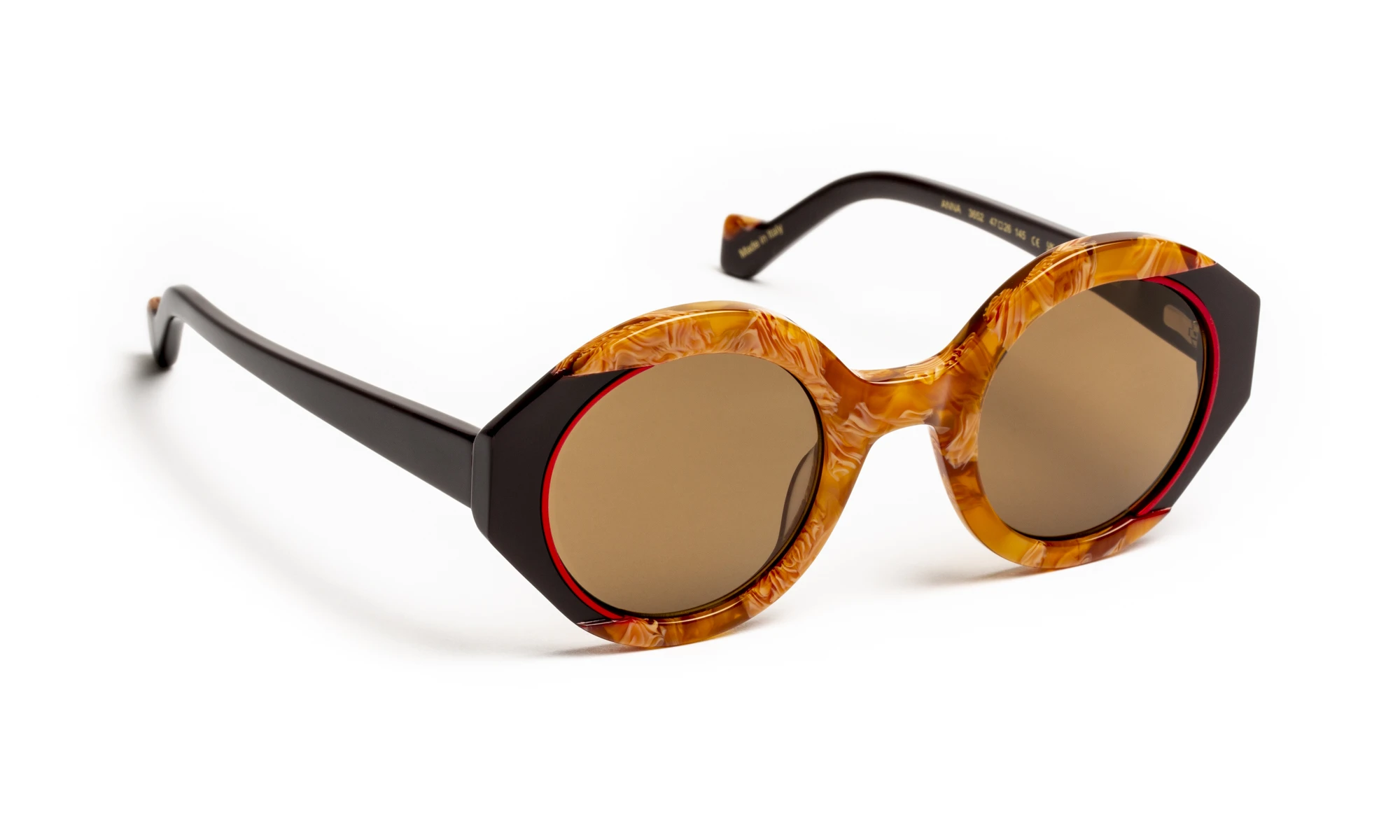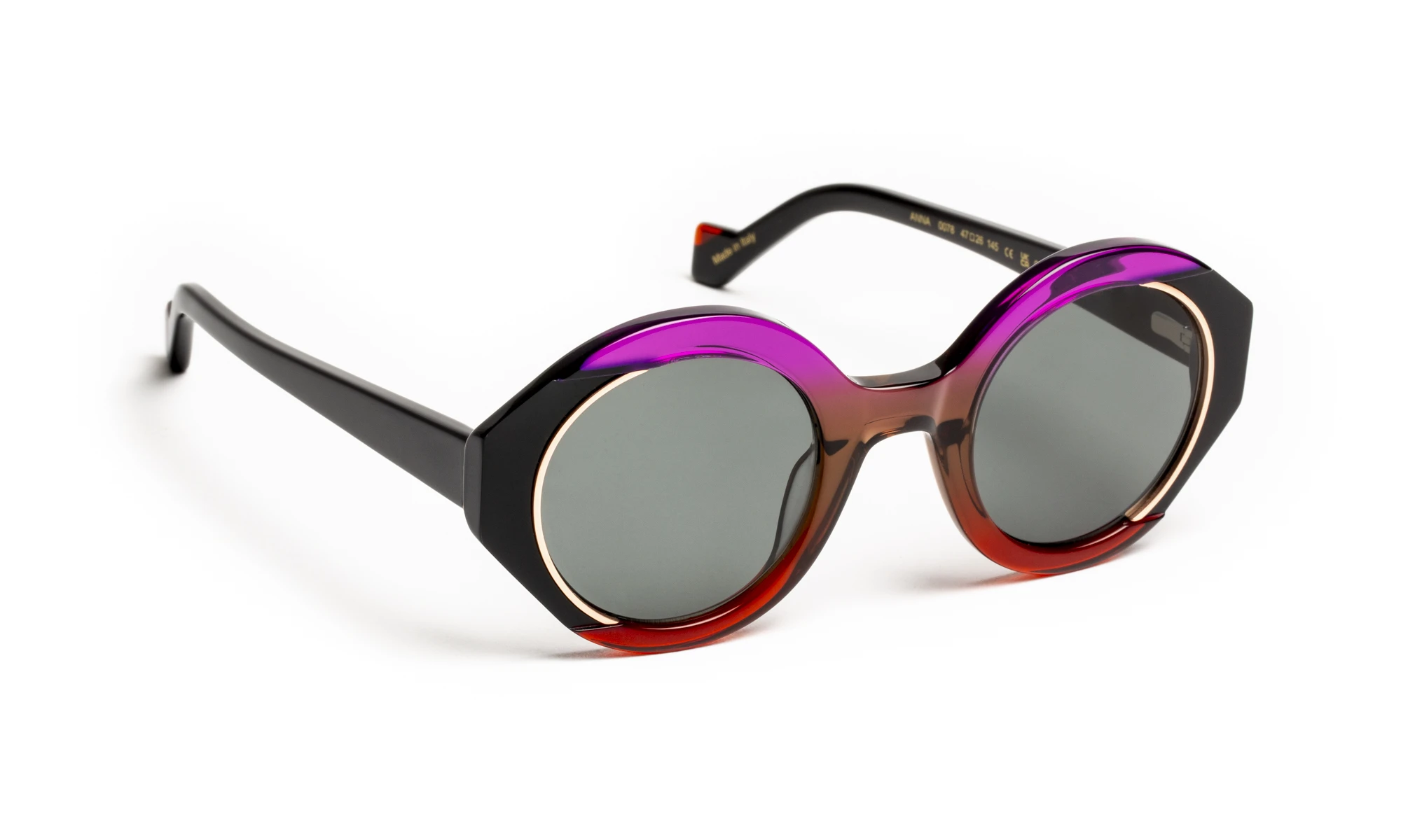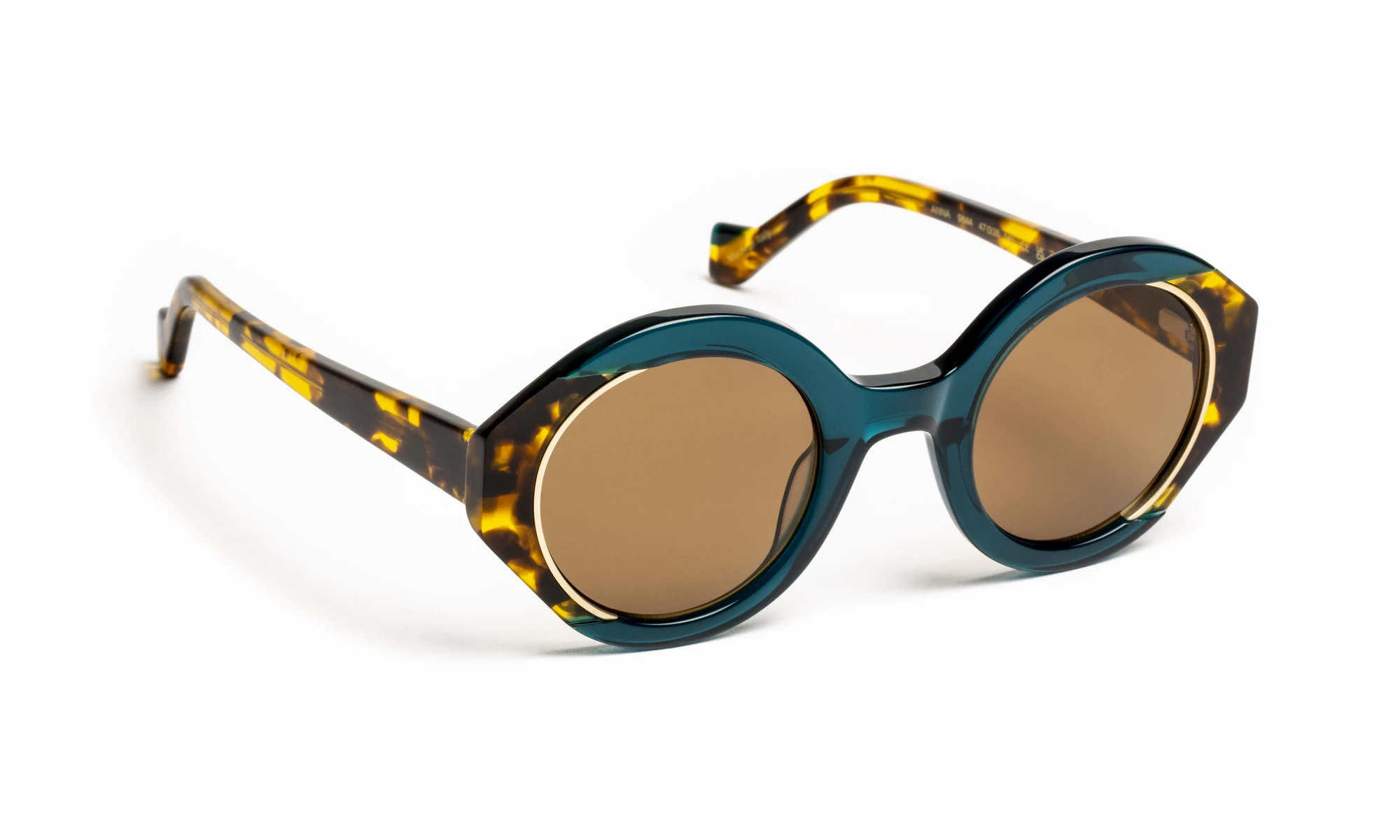 Monture solaire acétate et décoration métal, coloris composés d’écailles traditionnelles ou marbrées, dégradés translucides, collages graphiques.