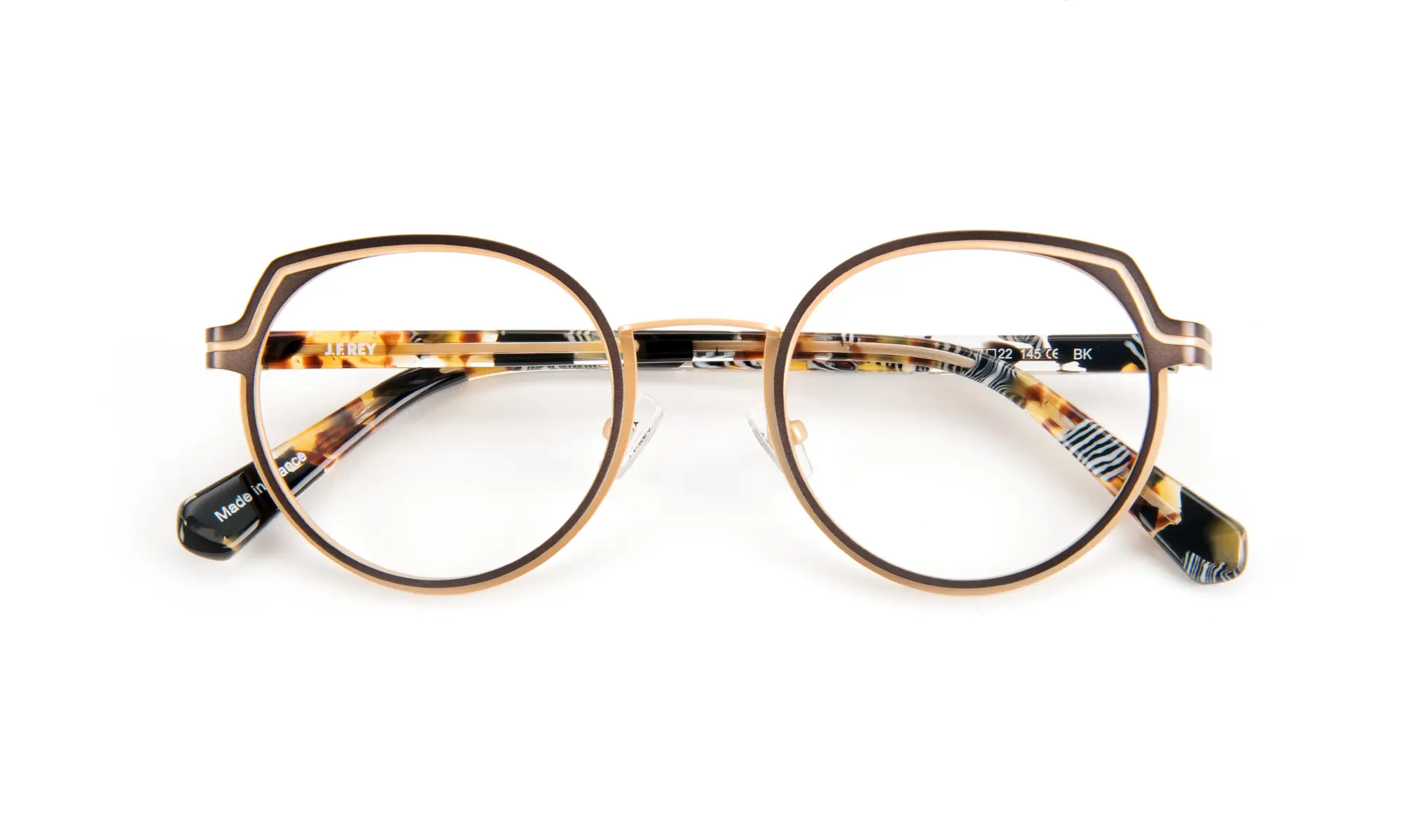 Monture avec face en métal et branches en acétate, se distinguant par une forme arrondie en métal fin ouvragé, au design graphique et élégant. La face présente un subtil jeu de coloris bicolores, rehaussé par des branches aux teintes coordonnées, offrant une allure contemporaine et sophistiquée.
